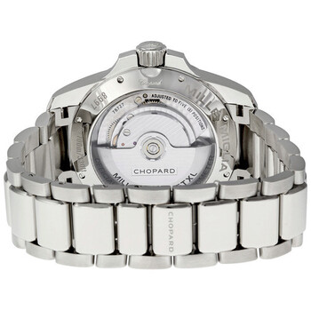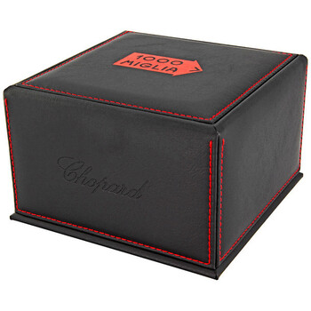 Stainless steel case with a stainless steel bracelet. Fixed bezel. Black dial with luminous hands and index hour markers. Minute markers around the outer rim. Arabic numerals mark the 6, and 12 o'clock position. GMT scale around the inner ring. Date display appears at the 3 o'clock position. Automatic movement. Scratch resistant sapphire crystal. Case diameter: 45 mm. Case thickness: 14.25 mm. Deployment clasp. Water resistant at 100 meters/ 330 feet. Functions: hours, minutes, seconds, calendar. Chopard Mille Miglia GT XL GMT Black Dial Men's Watch 15/8514-3001.