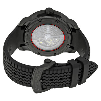 Black DLC stainless steel case with a black (tire profile) rubber strap. Fixed black DLC bezel. Black dial with luminous hands and index hour markers. Arabic numerals mark the 6 and 12 o'clcok positions. Minute markers around the outer rim. Dial Type: Analog. Luminescent hands and markers. Date display at the 3 o'clock position. Automatic movement. Scratch resistant sapphire crystal. Pull / push crown. Transparent case back. Case size: 43 mm. Case thickness: 11.3 mm. Round case shape. Tang clasp. Water resistant at 100 meters / 330 feet. Functions: date, hour, minute, second. Luxury watch style. Chopard Mille Miglia GTS Automatic Black Dial Men's Watch 168565-3002.