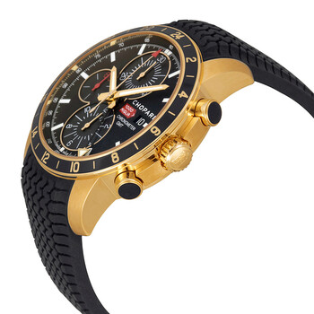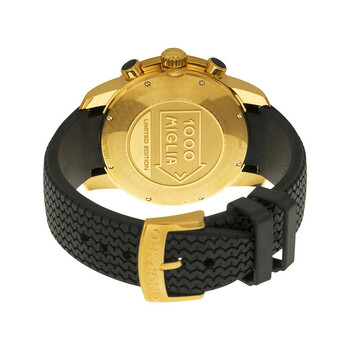 18kt rose gold case with a black rubber strap. Fixed 18kt rose gold bezel with black top ring showing 24 hour markings. Black dial with luminous hands and index hour markers. Minute markers. tachymeter around the outer rim. Dial Type: Analog. Luminescent hands and markers. Date display at the 3 o'clock position. Chronograph - three sub-dials displaying: 60 second, 30 minute and 12 hour. Mechanical movement with a 46 hour power reserve. Scratch resistant sapphire crystal. Solid case back. Case diameter: 42.50 mm. Case thickness: 14.85 mm. Round case shape. Tang clasp. Water resistant at 50 meters / 165 feet. Functions: chronograph, date, hour, minute, second. Additional Info: limited edition of 250 pieces. Luxury watch style. Watch label: Swiss Made. Chopard Mille Miglia Mechanical Chronograph Black Dial 18kt Rose Gold Men's Watch 161288-5001.