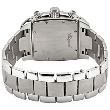 Stainless steel case with a stainless steel bracelet. Fixed bezel. Black dial with silver-tone hands and index-Arabic numerals hour markers. Dial Type: Analog. Date display between 4 and 5 o'clock position. Chronograph - three sub-dials displaying: 60 second, 30 minute and 12 hours. Automatic movement with a 46-hour power reserve. Solid case back. Square case shape. Case size: 34 mm x 39 mm. Functions: chronograph, date, hour, minute, second. Luxury watch style. Watch label: Swiss Made. Item Variations: 158462 3001, 158462.3001, 1584623001. Chopard Two O Ten Sport Chronograph Automatic Black Dial Men's Watch 158462-3001.