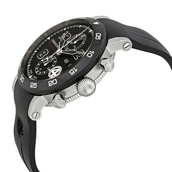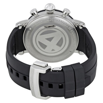 Silver-tone stainless steel case with a black rubber strap. Black bezel. Black dial with silver-tone hands and index-Arabic numerals hour markers. Minute markers around the outer rim. Dial Type: Analog. Day of the week and date display at the 3 o'clock position. Chronograph - three sub-dials displaying: 60 second, 30 minute and 12 hours. Automatic movement. Scratch resistant sapphire crystal. Case size: 44 mm. Case thickness: 15 mm. Round case shape. Water resistant at 100 meters / 330 feet. Functions: chronograph, date, day of the week hour, minute, second. Watch label: Swiss Made. ChronoSwiss TM Chrono Black Dial Automatic Men's Watch CH9043B-F4.