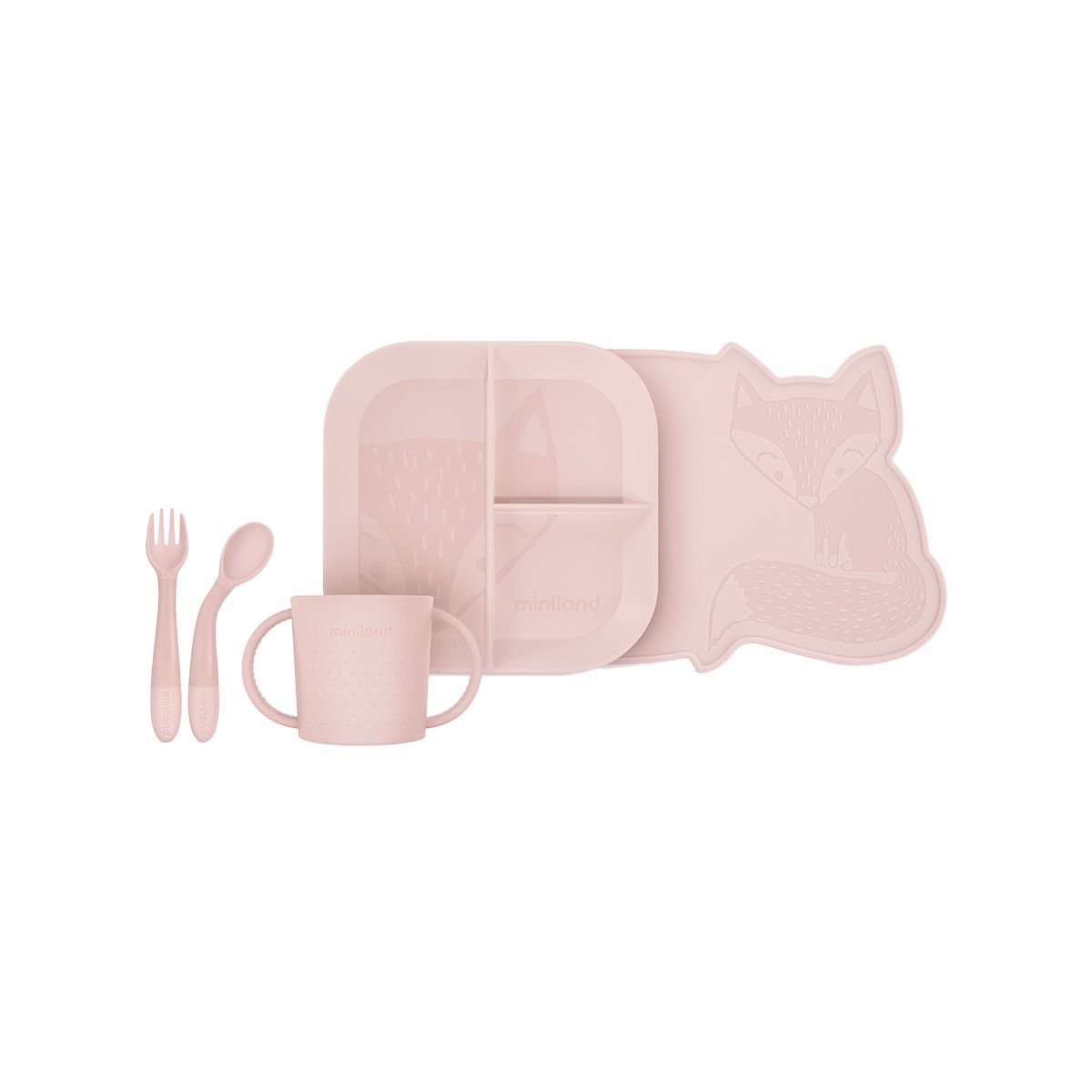 განყოფილებებიანი ჭურჭლის >ნაკრები, 5 ნივთით (თეფში, ჭიქა, ჩანგალი და კოვზი, ზედაპირზე დასაფენი). იდეალურია BLW კვებისათვის. კოვზისა და ჩანგლის უფრო მცირე ზომები დაეხმარება პატარებს დამოუკიდებლად მიირთვან მათი საკვები. პატარა ჭიქა სახელურებით კი მათ დაეხმარება ისწავლონ მისი სწორად დაჭერა. ამ ნაკრების ყველა ელემენტი შესაძლებელია მოთავსდეს ჭურჭლის სარეცხ მანქანაში და მიკროტალღურ ღუმელში.