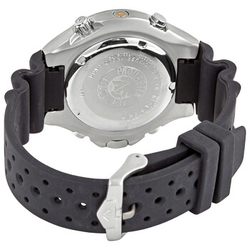 Silver-tone stainless steel case with a black rubber strap. Uni-directional rotating silver-tone stainless steel bezel. Black dial with red hands and index-Arabic hour markers. Minute markers around the outer rim. Dial Type: Analog-digital. Luminescent hands and markers. Full auto calendar. Quartz movement. Scratch resistant mineral crystal. Screw down crown. Solid case back. Round case shape, case size: 47 mm, case thickness: 15 mm. Buckle clasp. Water resistant at 200 meters / 660 feet. Functions: date, hour, minute, second, depth alarm, dive time alarm, 1/100 second chronograph, alarm,. Sport watch style. Watch label: Japan Movt. Citizen Aqualand Promaster Diver Black Dial Men's Watch JP1060-01E.