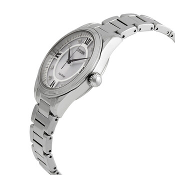 Stainless steel case with a stainless steel bracelet. Fixed stainless steel bezel. Silver dial with black hands and diamond hour markers. Roman numerals appear at the 3, 6, 9 and 12 o'clock positions. Minute markers around the outer rim. Dial Type: Analog. Citizen caliber E033 eco-drive movement. Scratch resistant sapphire crystal. Pull / push crown. Solid case back. Round case shape. Case size: 32 mm. Band width: 15 mm. Deployment clasp. Water resistant at 50 meters / 165 feet. Functions: hour, minute, second. Arezzo Series. Dress watch style. Watch label: Japan Movt. Citizen Arezzo Eco-Drive Silver Dial Ladies Watch EM0870-58A.