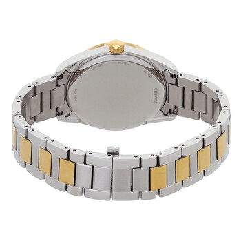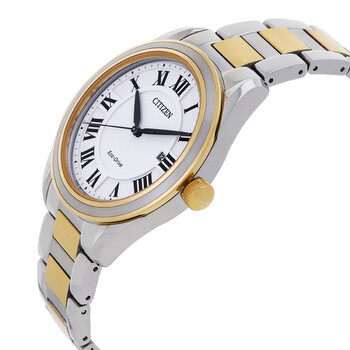 Silver-tone stainless steel case with a two-tone (silver-tone and yellow gold-tone) stainless steel bracelet. Two-tone (silver-tone and yellow gold-tone) stainless steel bezel. White dial with black hands and Roman numeral hour markers. Minute markers around the outer rim. Dial Type: Analog. Date display at the 3 o'clock position. Citizen Caliber J810 quartz movement. Scratch resistant sapphire crystal. Screw down crown. Solid case back. Round case shape, case size: 40 mm. Band width: 20 mm. Deployment with push button release clasp. Water resistant at 50 meters / 165 feet. Functions: date, hour, minute, second. Arezzo Series. Dress watch style. Watch label: Japan Movt. Citizen Arezzo Quartz White Dial Unisex Watch AW1694-50A.