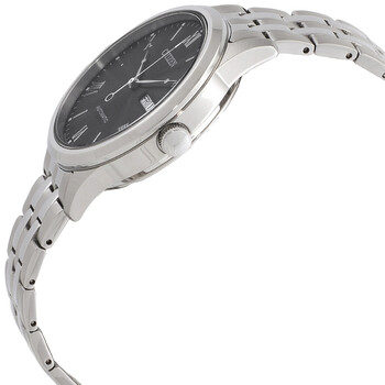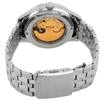 Silver-tone stainless steel case and bracelet. Fixed silver-tone stainless steel bezel. Grey dial with black hands and Roman numeral hour markers. Minute markers around the outer rim. Dial Type: Analog. Day and date display at the 3 o'clock position. Citizen Caliber 8200 automatic movement. Scratch resistant sapphire crystal. Screw down crown. Solid case back. Round case shape, case size: 40 mm, case thickness: 10.7 mm. Fold over clasp with a safety release. Water resistant at 50 meters / 165 feet. Functions: date, day, hour, minute, second. Sport watch style. Watch label: Japan Movt. Citizen Automatic Black Dial Ladies Watch NH7501-85H.
