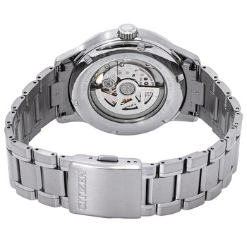 Silver-tone stainless steel case and bracelet. Fixed silver-tone stainless steel bezel. Black dial with silver-tone hands and index hour markers. Minute markers around the outer rim. Dial Type: Analog. Citizen Caliber 9040 automatic movement. Scratch resistant sapphire crystal. Transparent case back. Round case shape, case size: 41.3 mm, case thickness: 11.9 mm. Fold over clasp with a safety release. Water resistant at 100 meters / 330 feet. Functions: hour, minute, second. Casual watch style. Watch label: Japan Movt. Citizen Automatic Black Dial Men's Watch NB4020-96E.
