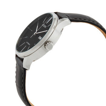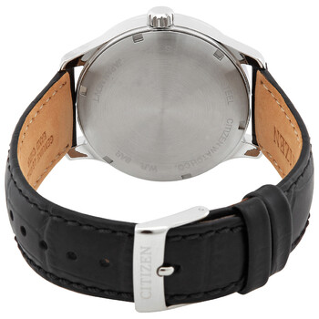 Silver-tone stainless steel case with a black leather strap. Fixed silver-tone stainless steel bezel. Black dial with silver-tone hands and Roman numeral hour markers. Minute markers around the outer rim. Dial Type: Analog. Day of the week and date display at the 3 o'clock position. Citizen Caliber 8200 automatic movement. Scratch resistant mineral crystal. Pull / push crown. Solid case back. Round case shape, case size: 40 mm, case thickness: 11.1 mm. Buckle clasp. Water resistant at 50 meters / 165 feet. Functions: date, day, hour, minute, second. Dress watch style. Watch label: Japan Movt. Citizen Automatic Black Dial Men's Watch NH8350-08E.