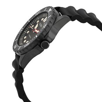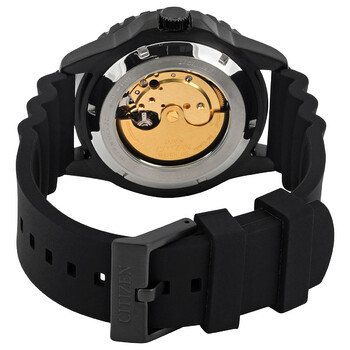 Black IP stainless steel case with a black rubber strap. Uni-directional rotating black stainless steel bezel. Black dial with silver-tone hands and dots hour markers. Minute markers around the outer rim. Dial Type: Analog. Luminescent hands and markers. Date display at the 3 o'clock position. Citizen Caliber 8210 Automatic movement, containing 21 Jewels, bitting at 21600 vph, and has a power reserve of approximately 45 hours. Scratch resistant mineral crystal. Transparent see through case back. Round case shape, case size: 43 mm, case thickness: 12.4 mm. Buckle clasp. Water resistant at 100 meters / 330 feet. Functions: date, hour, minute, second. Casual watch style. Watch label: Japan Movt. Citizen Automatic Black Dial Men's Watch NJ0125-11E.