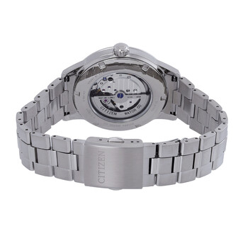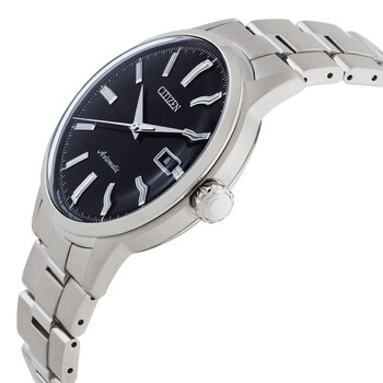 Silver-tone stainless steel case and bracelet. Fixed silver-tone stainless steel bezel. Black dial with silver-tone hands and index hour markers. Dial Type: Analog. Luminescent markers. Date display at the 3 o'clock position. 8310 automatic movement. Scratch resistant mineral crystal. Pull / push crown. Transparent see through case back. Round case shape, case size: 41 mm. Deployment with push button release clasp. Water resistant at 50 meters / 165 feet. Functions: date, hour, minute, second. Citizen Automatic Black Dial Men's Watch NK0000-95E.