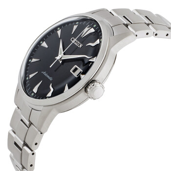 Silver-tone stainless steel case and bracelet. Fixed silver-tone stainless steel bezel. Black dial with silver-tone hands and index hour markers. Minute markers around the outer rim. Dial Type: Analog. Luminescent hands and markers. Date display at the 3 o'clock position. Citizen Caliber 8310 automatic movement. Scratch resistant mineral crystal. Solid case back. Round case shape, case size: 41 mm, case thickness: 12.6 mm. Fold over clasp with a safety release. Water resistant at 50 meters / 165 feet. Functions: hour, minute, second. Dress watch style. Watch label: Japan Movt. Citizen Automatic Black Dial Men's Watch NK0001-84E.