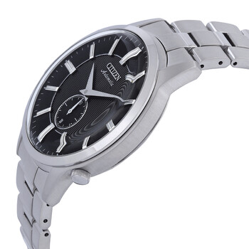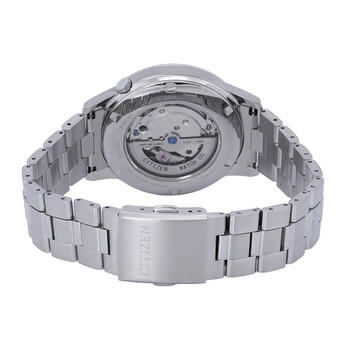 Silver-tone stainless steel case and bracelet. Fixed silver-tone stainless steel bezel. Black dial with silver-tone hands and index hour markers. Dial Type: Analog. Citizen Caliber 8322 automatic movement with a 60-hour power reserve. Scratch resistant mineral crystal. Pull / push crown. Transparent see through case back. Round case shape, case size: 41mm, case thickness: 12.9 mm. Water resistant at 50 meters / 165 feet. Functions: hour, minute, second. Additional Info: without radio reception function. Sport watch style. Watch label: Japan Movt. Citizen Automatic Black Dial Men's Watch NK5000-98E.