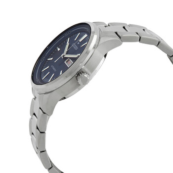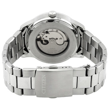 Silver-tone stainless steel case and bracelet. Fixed silver-tone stainless steel bezel. Blue dial with silver-tone hands and index hour markers. Minute markers around the outer rim. Dial Type: Analog. Day of the week and date display at the 3 o'clock position. Citizen Caliber 8200 automatic movement. Scratch resistant mineral crystal. Pull / push crown. Transparent case back. Round case shape, case size: 42 mm, case thickness: 12.5 mm. Band width: 22 mm. Fold over clasp with a safety release. Water resistant at 100 meters / 330 feet. Functions: date, day, hour, minute, second. Casual watch style. Watch label: Japan Movt. Citizen Automatic Blue Dial Men's Watch NH8400-87L.