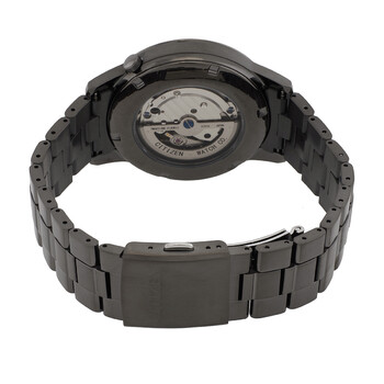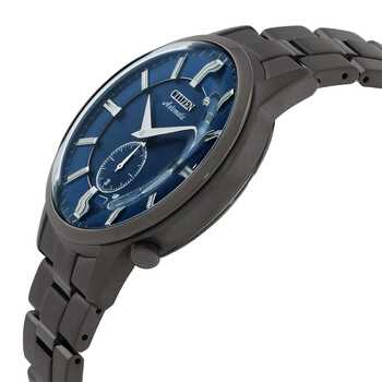 Silver-tone stainless steel, hard coating case and bracelet. Fixed silver-tone stainless steel bezel. Blue dial with silver-tone hands and index hour markers. Minute markers around the outer rim. Dial Type: Analog. Luminescent hands and markers. One-small sub second subdials. Citizen Caliber 8322 automatic movement. Scratch resistant mineral crystal. Solid case back. Round case shape, case size: 41 mm, case thickness: 12.9 mm. Fold over clasp with a safety release. Water resistant at 50 meters / 165 feet. Functions: hour, minute, second. Sport watch style. Watch label: Japan Movt. Citizen Automatic Blue Dial Men's Watch NK5009-69N.