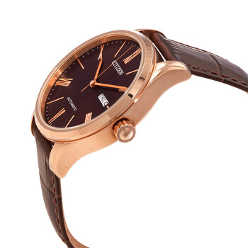 Rose gold-tone stainless steel case with a brown leather strap. Fixed rose gold-tone bezel. Brown dial with rose gold-tone hands and alternating Roman numeral and index hour markers. Minute markers around the outer rim. Dial Type: Analog. Day of the week and date display at the 3 o'clock position. Citizen caliber 8200 automatic movement. Scratch resistant mineral crystal. Pull / push crown. Solid case back. Round case shape. Case size: 40.8 mm. Case thickness: 11.1 mm. Band width: 20 mm. Tang clasp. Water resistant at 50 meters / 165 feet. Functions: date, day, hour, minute, second. Mechanical Series. Dress watch style. Watch label: Japan Movt. Citizen Automatic Brown Dial Brown Leather Men's Watch NH8363-14X.