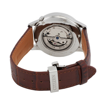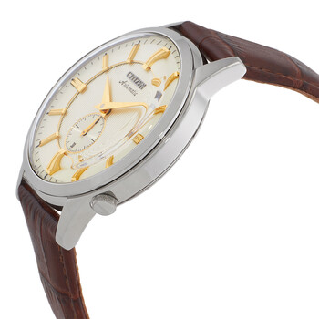 Silver-tone stainless steel case with a brown leather strap. Fixed silver-tone stainless steel bezel. Champagne dial with gold-tone hands and index hour markers. Minute markers around the outer rim. Dial Type: Analog. One subdial displaying: small second. Citizen Caliber 8322 automatic movement. Scratch resistant mineral crystal. Pull / push crown. Solid case back. Round case shape, case size: 41mm, case thickness: 12.9 mm. Water resistant at 50 meters / 165 feet. Functions: hour, minute, second. Citizen Automatic Champagne Dial Men's Watch NK5000-12P.