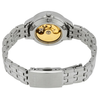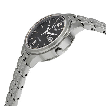 Stainless steel case with a stainless steel bracelet. Fixed stainless steel bezel. Black dial with silver-tone hands and index hour markers. Roman numerals mark the 6 and 12 o'clock positions. Minute markers around the outer rim. Dial Type: Analog. Date display at the 3 o'clock position. Citizen Caliber 6615 automatic movement. Scratch resistant sapphire crystal. Pull / push crown. Transparent case back. Round case shape. Case size: 29 mm. Case thickness: 11 mm. Band width: 14 mm. Fold over clasp. Water resistant at 50 meters / 165 feet. Functions: date, hour, minute, second. Casual watch style. Watch label: Japan Movt. Citizen Automatic Day-Date Black Dial Stainless Steel Ladies Watch PD7130-51E.