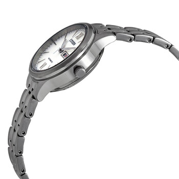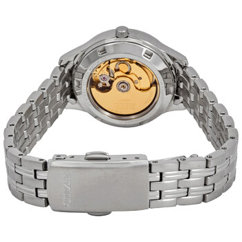 Stainless steel case with a stainless steel bracelet. Fixed stainless steel bezel. Cream dial with luminous silver-tone hands and index hour markers. Roman numerals mark the 6 and 12 o'clock positions. Minute markers around the outer rim. Dial Type: Analog. Luminescent hands. Date display at the 3 o'clock position. Citizen caliber 6615 automatic movement. Scratch resistant sapphire crystal. Pull / push crown. Transparent case back. Round case shape. Case size: 29 mm. Case thickness: 11 mm. Band width: 14 mm. Fold over clasp. Water resistant at 50 meters / 165 feet. Functions: date, hour, minute, second. Casual watch style. Watch label: Japan Movt. Citizen Automatic Day-Date Cream Dial Stainless Steel Ladies Watch PD7130-51A.