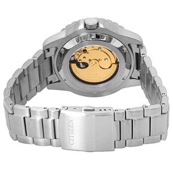 Silver-tone stainless steel case and bracelet. Green bezel. Green dial. Dial Type: Analog. Date display at the 3 o'clock position. 8210 automatic movement. Scratch resistant mineral crystal. Round case shape, case size: 43, case thickness: 12.4. Water resistant at 100 meters / 330 feet. Watch label: Japan Movt.