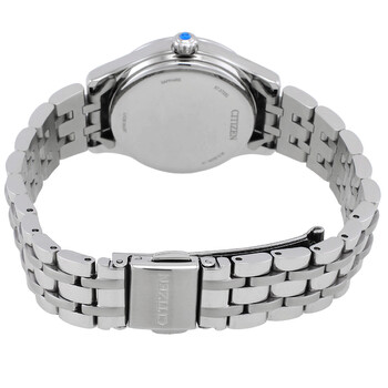 Silver-tone stainless steel case and bracelet. Fixed silver-tone stainless steel bezel. Silver dial with silver-tone hands and dots-Roman numeral hour markers. Roman numeral marker appears at the 3, 9 and 12 o'clock positions. Minute markers around the outer rim. Dial Type: Analog. Citizen Caliber 6628 automatic movement. Scratch resistant sapphire crystal. Pull / push crown. Solid case back. Round case shape, case size: 28.5 mm. Deployment with push button release clasp. Water resistant at 50 meters / 165 feet. Functions: hour, minute, second. Luna Series. Dress watch style. Watch label: Japan Movt. Citizen Automatic Silver Dial Ladies Watch PR1040-88A.