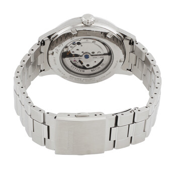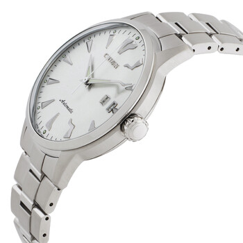 Silver-tone stainless steel case and bracelet. Fixed silver-tone stainless steel bezel. Silver dial with silver-tone hands and index hour markers. Minute markers around the outer rim. Dial Type: Analog. Luminescent hands. Date display at the 3 o'clock position. Citizen Caliber 8310 automatic movement. Scratch resistant mineral crystal. Pull / push crown. Transparent see through case back. Round case shape, case size: 41 mm, case thickness: 12.6 mm. Band width: 20 mm. Fold over clasp with a safety release. Water resistant at 50 meters / 165 feet. Functions: date, hour, minute, second. Dress watch style. Watch label: Japan Movt. Citizen Automatic Silver Dial Men's Watch NK0001-84A.