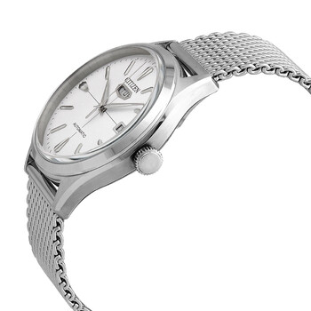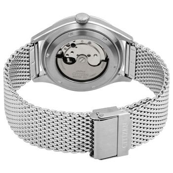 Stainless steel case with a stainless steel mesh bracelet. Fixed stainless steel bezel. Silver dial with luminous silver-tone hands and index hour markers. Minute markers around the outer rim. Dial Type: Analog. Day of the week display below the 12 o'clockposition. Date display at the 3 o'clock position. Citizen caliber 8200 automatic movement. Scratch resistant sapphire crystal. Transparent case back. Round case shape. Case size: 40.2 mm. Case thickness: 13.1 mm. Band width: 20 mm. Fold over slip through clasp. Water resistant at 200 meters / 660 feet. Functions: date, day, hour, minute, second, world time in 43 cities, alarm, 99-minute countdown timer, 1/1000-second chronograph. Casual watch style. Citizen Automatic Silver Dial Stainless Steel Mesh Men's Watch NH8390-89A.