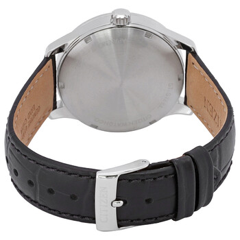Silver-tone stainless steel case with a black leather strap. Fixed silver-tone bezel. White dial with silver-tone hands and index hour markers. Dial Type: Analog. Day & date display at the 3 o'clock position. Citizen Caliber 8200 automatic movement. Scratch resistant mineral crystal. Solid case back. Round case shape, case size: 40 mm. Buckle clasp. Water resistant at 50 meters / 165 feet. Functions: date, day, hour, minute, second. Citizen Automatic White Dial Men's Watch NH8350-08B.