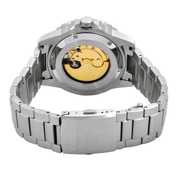 Silver-tone stainless steel case and bracelet. Blue stainless steel bezel. White dial with black hands and dots hour markers. Minute markers around the outer rim. Dial Type: Analog. Date display at the 3 o'clock position. Citizen Caliber 8210 Automatic movement, containing 21 Jewels, bitting at 21600 vph, and has a power reserve of approximately 45 hours. Scratch resistant mineral crystal. Transparent see through case back. Round case shape, case size: 43 mm, case thickness: 12.4 mm. Deployment with push button release clasp. Water resistant at 100 meters / 330 feet. Functions: date, hour, minute, second. Casual watch style. Citizen Automatic White Dial Watch NJ0171-81A.
