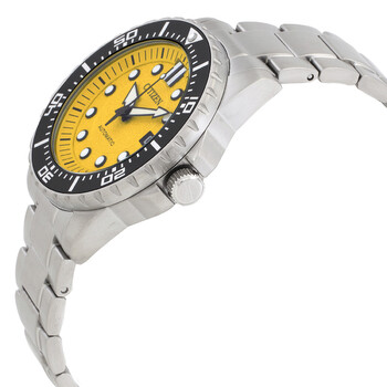 Silver-tone stainless steel case and bracelet. Uni-directional rotating silver-tone stainless steel bezel with an inlaid black ring. Yellow dial with black hands and index-Arabic numeral hour markers. Minute markers around the outer rim. Dial Type: Analog. Luminescent hands and markers. Date display at the 3 o'clock position. Citizen Caliber 8210 Automatic movement, containing 21 Jewels, bitting at 21600 vph, and has a power reserve of approximately 45 hours. Scratch resistant mineral crystal. Pull / push crown. Transparent see through case back. Round case shape, case size: 43 mm, case thickness: 12.4 mm. Water resistant at 100 meters / 330 feet. Functions: date, hour, minute, second. Casual watch style. Watch label: Japan Movt. Citizen Automatic Yellow Dial Men's Watch NJ0170-83Z.