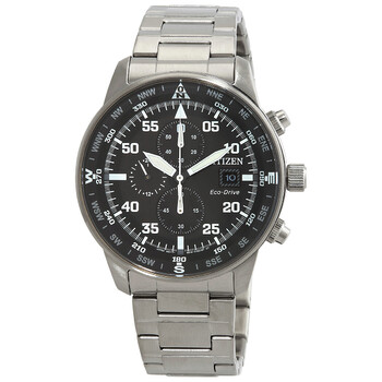 Silver-tone stainless steel case and bracelet. Black dial with black hands and index hour markers. Dial Type: Analog. Luminescent hands and markers. Date display at the 3 o'clock position. Chronograph - three sub-dials displaying: 60 second, 60 minute and 24 hours. Citizen Caliber B612 eco-drive movement. Scratch resistant mineral crystal. Screw down crown. Round case shape, case size: 44 mm, case thickness: 13 mm. Water resistant at 100 meters / 330 feet. Functions: chronograph, date, hour, minute, second. Aviator Series. Citizen Aviator Chronograph Black Dial Men's Watch CA0690-88E.