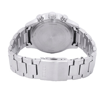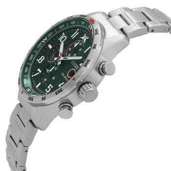 Silver-tone stainless steel case and bracelet. Rotating bezel silver-tone stainless steel bezel. Green dial with white hands and Arabic numeral hour markers. Minute markers around the outer rim. Dial Type: Analog. Luminescent hands and markers. Date display at the 3 o'clock position. Chronograph - three sub-dials displaying: 60 second, 60 minute and 24 hour. Caliber B612-00M eco-drive movement. Scratch resistant mineral crystal. Screw down crown. Solid case back. Round case shape, case size: 43 mm, case thickness: 13 mm. Band width: 22 mm. Deployment with push button release clasp. Water resistant at 100 meters / 330 feet. Functions: chronograph, date, hour, minute, second, solar-powered. Aviator Series. Sport watch style. Watch label: Japan Movt. Citizen Aviator Chronograph Green Dial Men's Watch CA0791-81X.