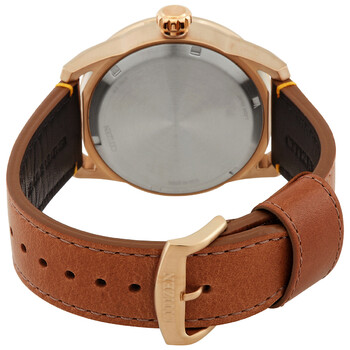 Rose gold-tone stainless steel case with a brown leather strap. Fixed rose gold-tone stainless steel bezel. Black dial with silver-tone hands and index hour markers. Minute markers around the outer rim. Dial Type: Analog. Luminescent hands and markers. Date display at the 3 o'clock position. Citizen Caliber Eco-Drive J810 eco-drive movement. Scratch resistant mineral crystal. Solid case back. Round case shape, case size: 45 mm. Band width: 22 mm. Tang clasp. Water resistant at 100 meters / 330 feet. Functions: date, hour, minute, second, solar-powered. Avion Series. Sport watch style. Watch label: Japan Movt. Citizen Avion Eco-Drive Black Dial Men's Watch AW1733-09E.