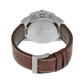 Stainless steel case with a brown leather strap. Fixed stainless steel bezel. Black dial with luminous silver-tone hands and index / small Arabic numeral hour markers. Arabic numeral minute markers (at 5 minute intervals). Minute markers around the outer rim. Dial Type: Analog. Luminescent hands and markers. Date display between the 4 and 5 o'clock positions. Chronograph - three sub-dials displaying: 60 second, 60 minute and 24 hour. Citizen caliber Eco-Drive B620 eco-drive movement. Scratch resistant mineral crystal. Pull / push crown. Solid case back. Round case shape. Case size: 45 mm. Case thickness: 13.5 mm. Band width: 23 mm. Band length: 7.5 inches. Tang clasp. Water resistant at 200 meters / 660 feet. Functions: chronograph, hour, minute, second. Additional Info: in general, suitable for swimming and snorkeling, but not scuba diving. Casual watch style. Watch label: Japan Movt. Citizen Avion Eco-Drive Chronograph Black Dial Men's Watch CA4210-24E.