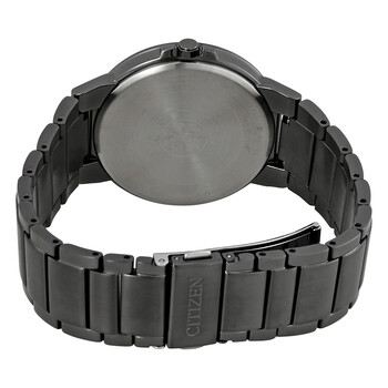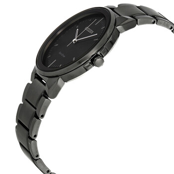 Black-plated stainless steel case and bracelet. Fixed black-plated bezel. Black dial with luminous silver-tone hands and index hour markers. Minute markers. Dial Type: Analog. Luminescent hands and markers. Citizen caliber Eco-Drive E031 eco-drive movement. Scratch resistant mineral crystal. Pull / push crown. Solid case back. Round case shape. Case size: 41 mm. Case thickness: 8 mm. Band width: 23 mm. Fold over clasp. Water resistant at 30 meters / 100 feet. Functions: hour, minute, second, solar-powered. Axiom Series. Casual watch style. Watch label: Japan Movt. Citizen Axiom Black Dial Men's Watch BJ6517-52E.
