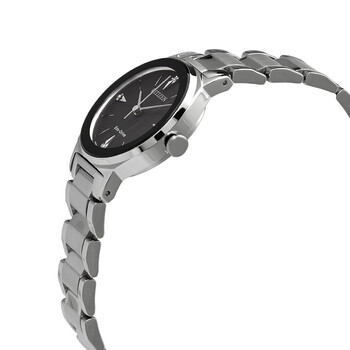 Stainless steel case with a stainless steel bracelet. Fixed stainless steel bezel. Black dial with silver-tone hands and index hour markers. Diamond-tipped index markers at the 3, 6, 9 and 12 o'clock positions. Dial Type: Analog. Citizen Caliber E031 eco-drive movement. Scratch resistant mineral crystal. Pull / push crown. Solid case back. Round case shape. Case size: 28.2 mm. Case thickness: 7.8 mm. Fold over clasp with a safety release. Water resistant at 30 meters / 100 feet. Functions: hour, minute, second. Axiom Diamond Series. Dress watch style. Watch label: Japan Movt. Citizen Axiom Diamond Black Dial Ladies Watch EM0730-57E.