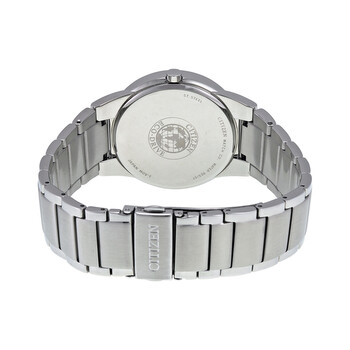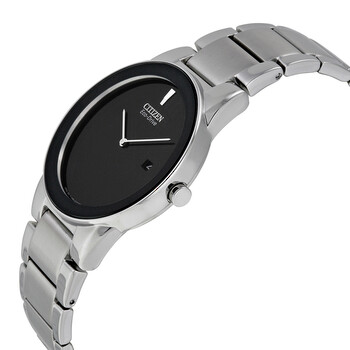 Stainless steel case with a stainless steel bracelet. Fixed stainless steel bezel. Black dial with silver-tone hands. A single marker is set at the 12 o'clock position. Dial Type: Analog. Date display at the 3 o'clock position. Eco-drive movement. Scratch resistant mineral crystal. Pull / push crown. Solid case back. Case size: 40 mm. Case thickness: 8 mm. Round case shape. Band width: 23 mm. Band length: 8 inches. Fold over clasp with a safety release. Water resistant at 10 meters / 33 feet. Functions: date, hour, minute. Dress watch style. Watch label: Japan Movt. Item Variations: AU1060 51E, AU1060.51E, AU106051E. Citizen Axiom Eco-Drive Black Dial Men's Watch AU1060-51E.