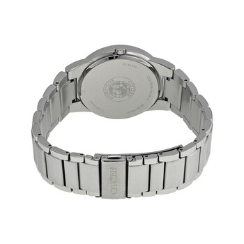Stainless steel case with a stainless steel bracelet. Fixed stainless steel bezel. Black dial with silver-tone hands and diamond hour markers. Dial Type: Analog. Date display at the 3 o'clock position. Eco-drive movement. Scratch resistant mineral crystal. Pull / push crown. Solid case back. Case diameter: 40 mm. Case thickness: 7 mm. Round case shape. Band width: 23 mm. Fold over clasp with safety release. Water resistant at 10 meters / 33 feet. Functions: date, hour, minute. Dress watch style. Watch label: Japan Movt. Item Variations: AU1060 51G, AU1060.51G, AU106051G. Citizen Axiom Eco-Drive Black Dial Men's Watch AU1060-51G.
