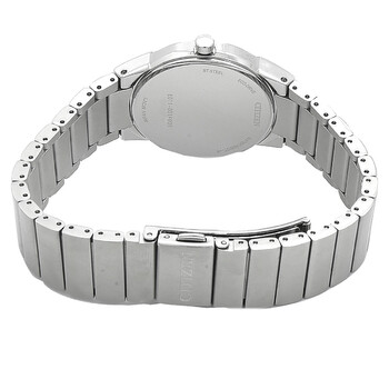 Silver-tone stainless steel case and bracelet. Fixed silver-tone stainless steel bezel. Blue dial with silver-tone hands and index hour markers. Minute markers around the outer rim. Dial Type: Analog. Date display at the 3 o'clock position. Citizen Caliber Eco-Drive E011 eco-drive movement. Scratch resistant mineral crystal. Pull / push crown. Solid case back. Round case shape, case size: 32 mm. Deployment with push button release clasp. Water resistant at 30 meters / 100 feet. Functions: date, hour, minute, second, solar-powered. Axiom Series. Casual watch style. Watch label: Japan Movt. Citizen Axiom Eco-Drive Blue Dial Ladies Watch EW2670-53L.