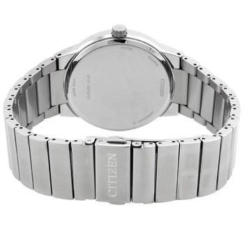 Silver-tone stainless steel case and bracelet. Fixed silver-tone stainless steel bezel. Blue dial with silver-tone hands and index hour markers. Minute markers around the outer rim. Dial Type: Analog. Date display at the 3 o'clock position. Citizen Caliber Eco-Drive E111 eco-drive movement. Scratch resistant mineral crystal. Pull / push crown. Solid case back. Round case shape, case size: 40 mm. Fold over clasp with a safety release. Functions: date, hour, minute, second, solar-powered. Axiom Series. Casual watch style. Watch label: Japan Movt. Citizen Axiom Eco-Drive Blue Dial Unisex Watch BM7580-51L.