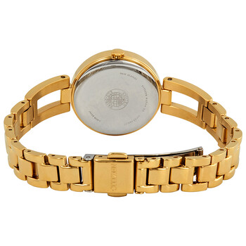 Yellow gold-tone stainless steel case and bracelet. Fixed yellow gold-tone bezel. Champagne dial with yellow gold-tone hands and index hour markers. Dial Type: Analog. Citizen caliber E031 eco-drive movement. Scratch resistant mineral crystal. Pull / push crown. Solid case back. Round case shape. Case size: 28 mm. Case thickness: 9 mm. Band width: 12 mm. Fold over clasp with a push button release. Water resistant at 30 meters / 100 feet. Functions: hour, minute, second. Casual watch style. Watch label: Japan Movt. Citizen Axiom Eco-Drive Champagne Dial Yellow Gold-tone Ladies Watch EM0638-50P.