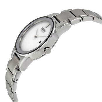 Stainless steel case with a stainless steel bracelet. Fixed stainless steel bezel. Silver dial with silver-tone hands. A single marker appears at the 12 o'clock position. Dial Type: Analog. Date display at the 3 o'clock position. Quartz movement. Scratch resistant mineral crystal. Pull / push crown. Solid case back. Case diameter: 32 mm. Case thickness: 8 mm. Round case shape. Band width: 16 mm. Fold over clasp with a safety release. Water resistant at 30 meters / 100 feet. Functions: date, hour, minute, second. Casual watch style. Watch label: Japan Movt. Item Variations: GA1050 51A, GA1050.51A, GA105051A. Citizen Axiom Eco-Drive Silver Dial Stainless Steel Quartz Ladies Watch GA1050-51A.