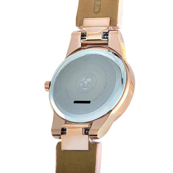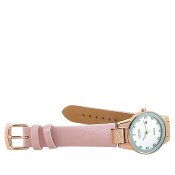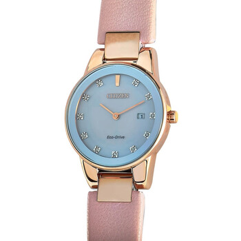 Rose gold-tone stainless steel case with a pink leather strap. Fixed rose gold-tone bezel. White dial with rose gold-tone hands and crystal hour markers. Dial Type: Analog. Date display at the 3 o'clock position. Citizen caliber Eco-Drive J015 quartz movement. Scratch resistant mineral crystal. Pull / push crown. Solid case back. Round case shape. Case size: 30 mm. Tang clasp. Water resistant at 30 meters / 100 feet. Functions: date, hour, minute. Axiom Series. Luxury watch style. Watch label: Japan Movt. Citizen Axiom Quartz White Dial Ladies Watch GA1058-08A.