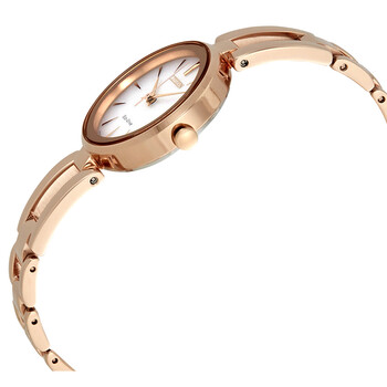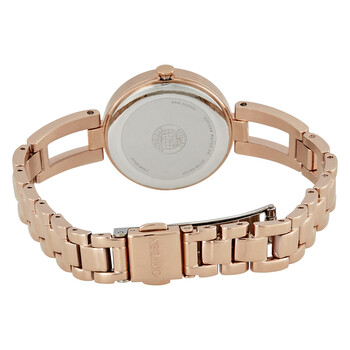 Pink gold-tone stainless steel case with a pink gold-tone stainless steel bracelet. Fixed pink gold-tone stainless steel bezel. Silver-tone dial with pink gold-tone hands and index hour markers. Dial Type: Analog. Citizen Caliber Eco-Drive E031 eco-drive movement. Scratch resistant mineral crystal. Pull / push crown. Solid case back. Round case shape. Case size: 28 mm. Case thickness: 9 mm. Band width: 12 mm. Fold over clasp. Water resistant at 30 meters / 100 feet. Functions: hour, minute, second, solar-powered. Casual watch style. Watch label: Japan Movt. Citizen Axiom Silver Dial Ladies Watch EM0633-53A.