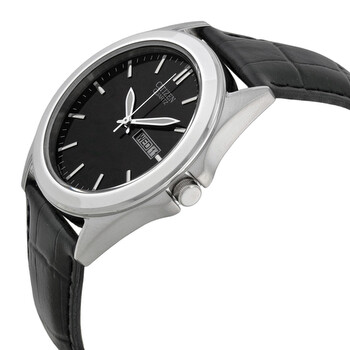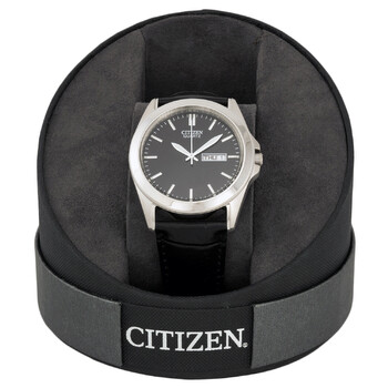 Stainless steel case with a black leather strap. Fixed stainless steel bezel. Black dial with luminous hands and index hour markers. Minute markers around the outer rim. Dial Type: Analog. Luminescent hands and markers. Day of the week and date display at the 3 o'clock position. Quartz movement. Scratch resistant mineral crystal. Pull / push crown. Solid case back. Round case shape. Case size: 39.50 mm. Case thickness: 9 mm. Band width: 22 mm, band length: 8.5 inches. Tang clasp. Water resistant at 30 meters / 100 feet. Functions: date, hour, minute, second. Dress watch style. Watch label: Japan Movt. Item Variations: BF0580 06E, BF0580.06E, BF058006E. Citizen Black Dial Black Leather Men's Watch BF0580-06E.