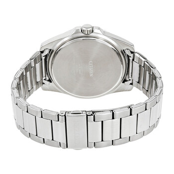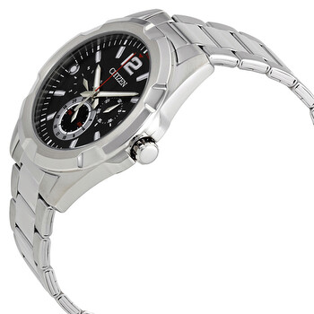 Stainless steel case with a stainless steel bracelet. Fixed bezel. Black dial with silver-tone hands and index-Arabic at the 12 o' clock hour markers. Dial Type: Analog. Luminescent hands and markers. Date display at the 3 o'clock position. Three- date, day of the week, and 24 hours. Quartz movement. Scratch resistant mineral crystal. Pull / push crown. Solid case back. Case size: 44 mm. Round case shape. Deployment with push button release clasp. Water resistant at 50 meters / 165 feet. Functions: date, day, hour, minute, second, 12/24 hour. Casual watch style. Citizen Black Dial Men's Multifunction Quartz Watch AG8330-51F.