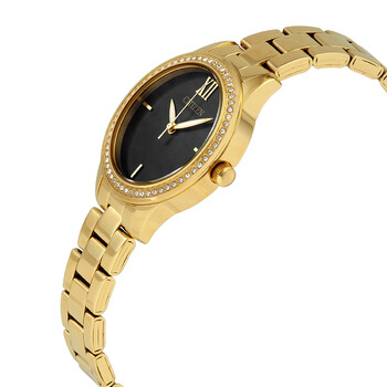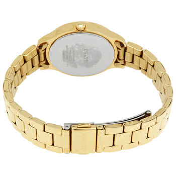 Yellow gold-tone stainless steel case and bracelet. Fixed yellow gold-tone bezel set with Swarovski crystals. Black dial with luminous yellow gold-tone leaf-style hands. A Roman numeral appears at the 12 o'clock position. Index markers at the 3, 6 and 9 o'clock positions. Dial Type: Analog. Quartz movement. Scratch resistant mineral crystal. Pull / push crown. Solid case back. Round case shape. Case size: 32 mm. Fold over clasp with a push button release. Water resistant at 30 meters / 100 feet. Functions: hour, minute, second. Dress watch style. Watch label: Japan Movt. Citizen Black Dial Quartz Ladies Crystal Watch EL3082-55E.