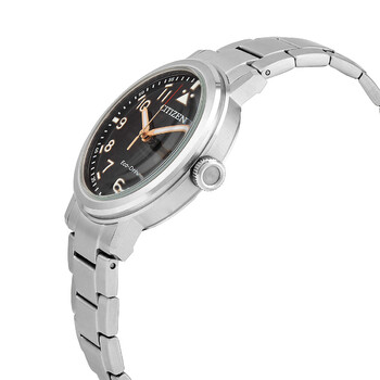 Stainless steel case with a stainless steel bracelet. Fixed stainless steel bezel. Black dial with luminous rose gold-tone hands and Arabic numeral hour markers. Arabic numeral minute markers (at 5 minute intervals). Minute markers around the outer rim. Dial Type: Analog. Luminescent hands and markers. Date display at the 3 o'clock position. Citizen caliber Eco-Drive J810 eco-drive movement. Scratch resistant mineral crystal. Pull / push crown. Solid case back. Round case shape. Case size: 42 mm. Case thickness: 11 mm. Band width: 20 mm. Fold over clasp with a push button release. Water resistant at 100 meters / 330 feet. Functions: date, hour, minute, second, solar-powered. Eco-drive Series. Casual watch style. Watch label: Japan Movt. Citizen Black Dial Stainless Steel Men's Watch AW1620-81E.