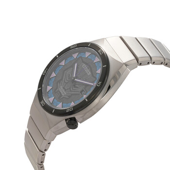 Silver-tone titanium case and bracelet. Fixed silver-tone titanium bezel. Black dial with purple hands. Dial Type: Analog. Luminescent hands and markers. Date display at the 3 o'clock position. Citizen Caliber Eco-Drive J810 eco-drive movement. Scratch resistant sapphire crystal. Solid case back. Round case shape, case size: 41 mm. Band width: 13.8 mm. Fold over clasp with a safety release. Water resistant at 100 meters / 330 feet. Functions: date, hour, minute, second, solar-powered. Black Panther Series. Dress watch style. Watch label: Japan Movt. Citizen Black Panther Eco-Drive Black Dial Men's Watch AW1668-50W.