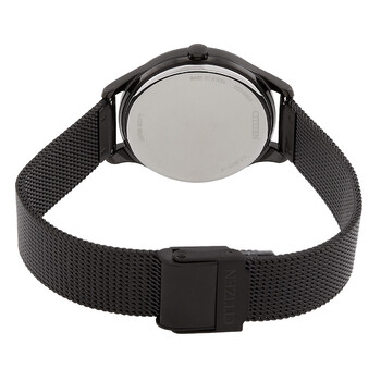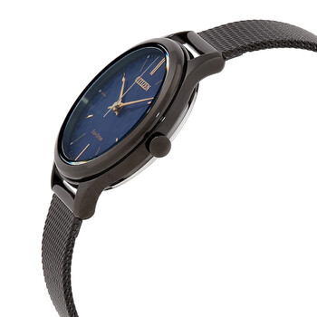 Black stainless steel case and bracelet. Fixed black bezel. Blue dial with rose gold-tone hands and index hour markers. Minute markers around the outer rim. Dial Type: Analog. Citizen Caliber Eco-Drive E031 eco-drive movement. Scratch resistant mineral crystal. Pull / push crown. Solid case back. Round case shape, case size: 32 mm, case thickness: 7.3 mm. Buckle clasp. Water resistant at 50 meters / 165 feet. Functions: hour, minute, second. Dress watch style. Watch label: Japan Movt. Citizen Blue Dial Ladies Watch EM0505-88L.