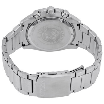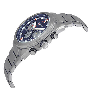 Silver-tone stainless steel case with a silver-tone stainless steel bracelet. Fixed silver-tone stainless steel bezel. Blue dial with luminous silver-tone hands and index hour markers. Minute markers. tachymeter markings around the outer rim. Dial Type: Analog. Luminescent hands and markers. Date display between the 4 and 5 o'clock positions. Chronograph - three sub-dials displaying: 60 second, 60 minute and 24 hours. Citizen Caliber Eco-Drive B620 eco-drive movement. Scratch resistant mineral crystal. Solid case back. Round case shape, case size: 44 mm, case thickness: 12 mm. Band width: 20 mm. Fold over clasp. Water resistant at 100 meters / 330 feet. Functions: chronograph, tachymeter, date, hour, minute, second, solar-powered. Sport watch style. Watch label: Japan Movt. Citizen Blue Dial Men's Chronograph Eco-Drive Watch CA4220-55L.